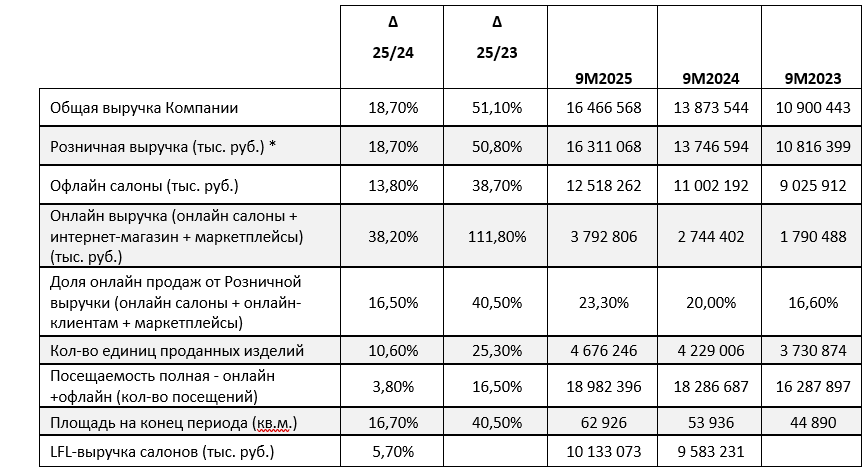 Благодаря повышению эффективности управления, наша динамика роста LFL-продаж в сопоставимых салонах за 9 месяцев 2025 года составила + 5,7% к 9 месяцам 2024 года.